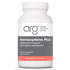 Allergy Research Group Homocysteine Plus an updated version of our original Homocysteine Metabolite Formula. It provides the primary nutrients known to be necessary for the breakdown of homocysteine into methionine and other metabolites, including vitamin B6 as pyridoxine and pyridoxal-5'-phosphate (P5P), vitamin B12 as methylcobalamin, folate as 5-methyltetrahydrofolate (5-MTHF), trimethylglycine (TMG), and L-serine. It is now enhanced with vitamin B2 as riboflavin-5-phosphate, Setria glutathione, zinc, and increased amounts of activated pyridoxal-5'-phosphate.