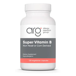 Allergy Research Group Super Vitamin B Complex is a dietary supplement providing all essential B-vitamins. This complex provides all eleven B-vitamins which includes the coenzyme forms of vitamins B6 and B2 allowing for extra pantothenic acid and enhanced bioavailability. B-vitamins are essential for support of a healthy nervous system, a healthy digestive process, energy production in the conversion of carbohydrates and other nutrients, and healthy, skin, hair and nail maintenance. This complex uses vitamins synthesized from hydrocarbons that come from living sources with low allergy potential instead of plant sources like yeast or corn.
