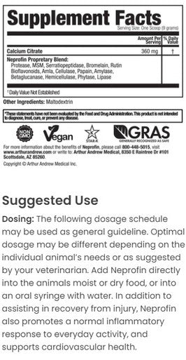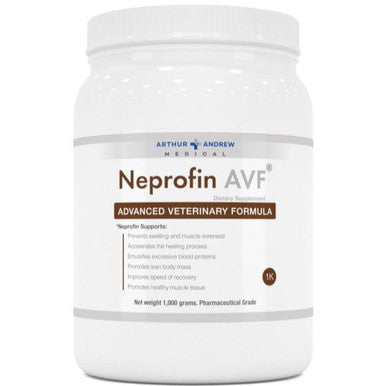 Arthur Andrew Medical Neprofin 1000grams is a blend of enzymes, antioxidants and bioflavonoids used to decrease the recovery time for athletic animal injuries. Neprofin improves circulation, speeds tissue repair, alleviates joint discomfort, supports cardiovascular health and relieves respiratory problems. Neprofin is non-toxic and can be used as a long-term replacement therapy for most injuries without the risk of side effects.