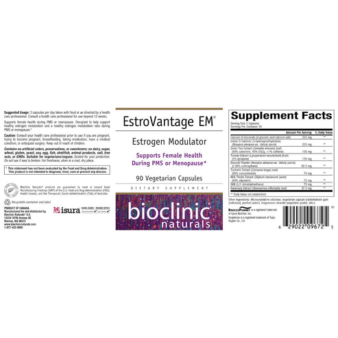 Bioclinic Naturals EstroVantage EM Bioclinic Naturals EstroVantage EM supports women's health during PMS and menopause by promoting balanced estrogen metabolism, which can improve breast health and reduce risks linked to hormone imbalance. It also enhances liver enzyme function, aiding detoxification, and provides antioxidant support for overall cellular health. This combination helps manage hormone-related symptoms and supports the body's natural processes for maintaining hormonal balance.