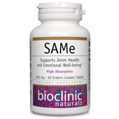 Bioclinic Naturals SAMe (S-Adenosyl-L-Methionine) is a supplement that supports mood balance, joint health, and liver function. SAMe plays a key role in neurotransmitter production, promoting emotional well-being and mental clarity. It also supports healthy cartilage and joint function by aiding in the synthesis of proteoglycans, essential components of connective tissue. Additionally, SAMe enhances liver detoxification processes and supports overall liver health. This supplement is ideal for individuals seeking natural support for mood, joint comfort, and liver function.