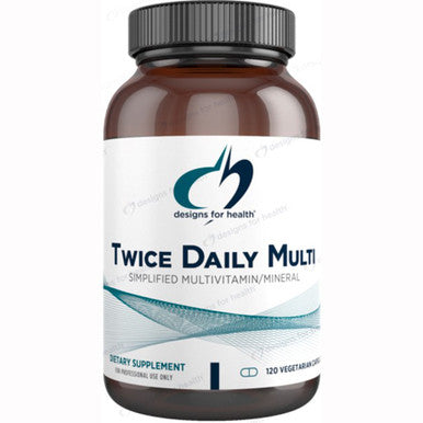 Designs for Health Twice Daily Multi is a dietary supplement providing optimal nutrient amounts that are not obtained easily in most diets. This formulation includes high quality ingredients such as vitamin E as high gamma mixed tocopherols, Blend of of isomer naturally occurring folates, and true amino acid chelate minerals.Recommended Use: Take 2 capsules per day with meals, or as directed by a healthcare professional.