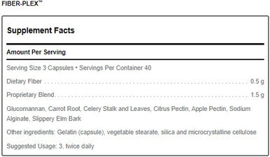 Douglas Laboratories Fiber-Plex supports the gastrointestinal tract by providing both insoluble and soluble fiber. Insoluble fiber like cellulose and many hemicelluloses are not fermented efficiently in the colon. They provide fecal bulk, bind water, and help soften the stool. Soluble dietary fiber like pectin, some hemicelluloses, and many gums ferment in the colon in varying degrees. This lowers the pH and short chain fatty acids that is important for mucosal cell health and intestinal micorflora.Recommended use: Take 3 capsules with at least 8 ounces of water twice daily, or as directed by a healthcare professional. The capsules may also be pulled apart, if desired, and the contents stirred into 8 ounces of water or juice.