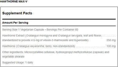 Douglas Laboratories Hawthorne Max-V supports cardiovascular health, heart and the circulatory system.Recommended use: Take 1 capsule daily between meals, or as directed by a healthcare professional. If digestive irritation occurs, take with meals.