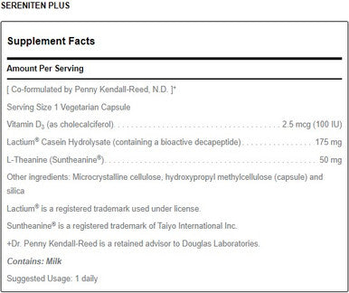 Douglas Laboratories Sereniten Plus combination of Lactium casein decapeptide. L-Theanine and Vitamin D to support the Hypothalamic-Pituitary-Adrenal (HPA) axis and feedback loop for stress management and cortisol regulation. Lactium and L-Theanine have been shown to provide a calming effect and may support normal sleep that is effected by stress. For Stress and to re-establish the HPA Axis.Recommended Use: Take 1 capsule daily on an empty stomach or as directed by a healthcare professional.