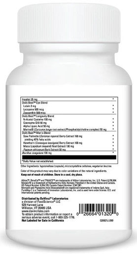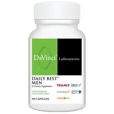 DaVinci Laboratories Daily Best Men daily multi vitamin and mineral supplement that targets the diverse needs of men. Three key blends are included to provide unparalleled system specific support such as €¢ Eye Blend: Comprised of lutein, zeaxanthin and lycopene, all necessary for long term eye health and to support the retina and macula when exposed to blue light emitting devices. €¢ Longevity Blend: This powerhouse blend of NAC, CoQ10, Alpha Lipoic Acid and Meriva Curcumin Phytosome provides the foundational support for metabolic and neurological health as well as optimal detoxification. €¢ Men's Blend: Men need targeted support as much as women when it comes to hormones as well as cardiovascular and prostate health.