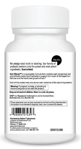 DaVinci Laboratories Hair Effects supports hair health for both men and women. This vegetarian formula contains nutrients that are recognized for their support for the repair of damaged hair follicles.