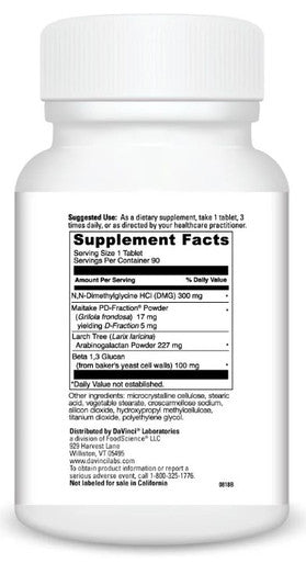 DaVinci Laboratories Immuno-DMG is a dietary supplement for immune system function support. This supplement combines 8 powerful nutrients that includes DMG and Larch Tree. DMG supports increased resistance to microorganisms; Larch Tree supports the production of immune cells; and Maitake mushroom is a concentrated source of Beta-1,6-Glucans that support the body's first line of defense. Immuno-DMG is beneficial for anyone who would benefit from immune system support.