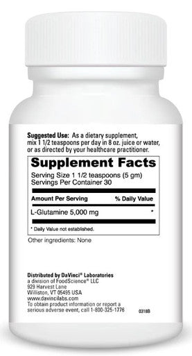 DaVinci Laboratories L-Glutamine Powder Supports G.I. tract integrity, immune system function, synthesis of skeletal muscle proteins, RNA and DNA, maintains proper acid/alkaline balance in the body, clears ammonia from tissues, GABA production for brain function and mental activity and passes the blood-brain barrier to act as energy for the brain.