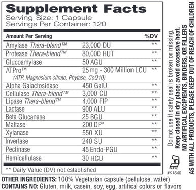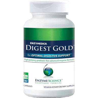 Enzyme Science Digest Gold 120 caps supports the break down of all components of a meal, digestive formula, nutrient absorption, and energy promotion. Vegan and Kosher product without probiotics.