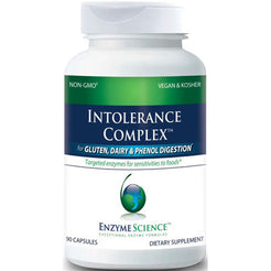 Enzyme Science Intolerance Complex 90caps supports digestive relief for occasional bloating, gas, indigestion, speeds up digestion, boosts energy, provides additional enzymes for meal digestion of fat, fiber, and protein, and is specialized for gluten, casein, lactose, complex carbohydrates and phenol sensitivities.
