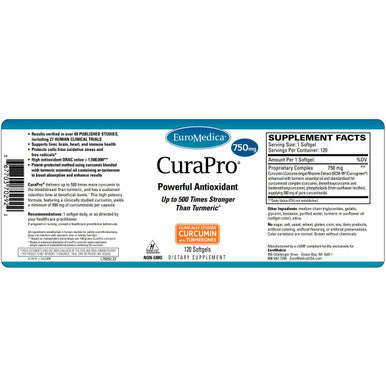EuroMedica CuraPro 750 is a dietary supplement for liver, brain, heart, and immune health support. CuraPro offers a high antioxidant value to protect cells from free radicals and oxidative stress damage. CuraPro offers absorbability up to 10 times better than plain curcumin with a sustained retention time in the body. Turmeric essential oil is used to boost the absorption of curcumin. Recommended usage: 1 softgel daily, may increase as desired or as directed by your healthcare practitioner.