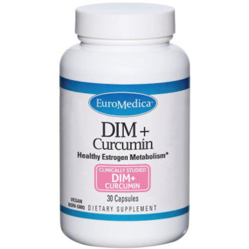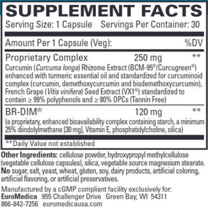EuroMedica DIM + Curcumin for healthy estrogen balance and metabolism. Clinically Studied Curcumin: The most clinically studied, enhanced absorption curcumin in the world with more than 50 published studies, 22 of which are HUMAN CLINICAL TRIALS. Clinically Studied BR-DIM: Demonstrated better absorption, making it more effective than ordinary DIM for estrogen balance and detoxification. You would have to consume 2 lbs. of broccoli to match this level of DIM. French Grape Seed VX1: This exclusive, tannin free extract is standardized for only highly absorbable, low molecular weight oligomeric proanthocyanidins (OPCs).Supports healthy estrogen metabolism to support mood, weight, energy levels, and overall well-being. Perimenopause and PMS symptom relief, promotes estrogen and progesterone balance, and healthy metabolism and weight management.