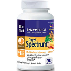Enzymedica Digest Spectrum supports the break down of gluten, phenols, lactose, and casein to help alleviate multiple food intolerances, fast digestive relief of occasional bloating, gas, indigestion, irregularity, heartburn, and helps speed up digestion and boosts energy.