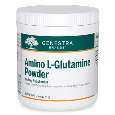 Genestra Amino L-Glutamine contains L-Glutamine to support digestion, intestinal health, immune health, alcohol and sugar cravings, muscle repair, fatigue, joint wear and tear, connective tissue, physical stress.