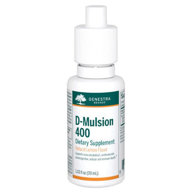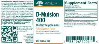 Genestra D-Mulsion 400 supports musculoskeletal, cardiovascular, neurocognitive, cellular and immune health. Natural Lemon Flavor.