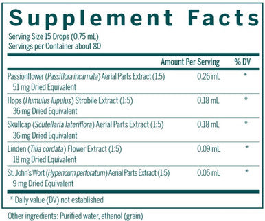 - Hops (Humulus lupulus) Strobile Extract (1:5) 36 mg Dried Equivalent 0.18 ml