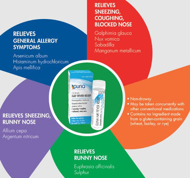 Guna Hay Fever Relief supports relief of allergy symptoms such as sneezing, coughing, blocked nose, and runny nose.