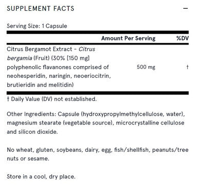 - Citrus Bergamot extract - Citrus bergamia (fruit) (30% (150 mg) polyphenolic flavanones comprised of neohesperidin, naringin, neoeriocitrin, brutieridin and melitidin) 500 mg