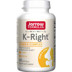 Jarrow Formulas K-Right promotes bone and cardiovascular health. A synergistic combination of three forms of Vitamin K: MK-7, MK-4 and K1, plus vitamin D3 to promote bone and cardiovascular health. Vitamin K is essential for the carboxylation of osteocalcin, which binds calcium in bones. Vitamin D3 is essential for the production of osteocalcin. MK-7 is a product of natural fermentation using Bacillus subtilis subsp. natto.