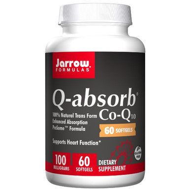 Jarrow Formulas Q-absorb CoQ10 100mg supports heart function. Q-absorb is a proliposome lipid-soluble delivery system clinically shown in humans to increase Co-Q10 levels by nearly 400% over baseline with exercise and 3-4 times better absorbed than chewable Co-Q10 tablets. Co-Q10 supports heart function as a component of the electron transport system, needed for ATP (i.e., energy) production within the cells, and as an antioxidant protects mitochondrial membranes and cholesterol from oxidation. Q-absorb restores Co-Q10 levels reduced by the use of statins. Co-Q10 is derived from fermentation and consists only of the natural trans configuration, the same as is synthesized in the human body. Supports clinical research on Coenzyme Q10.