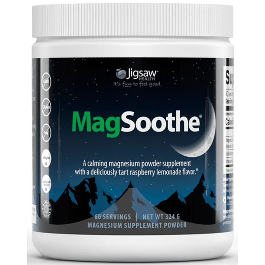 Jigsaw Health MagSoothe Raspberry Lemonade this is a powder form for rapid absorption & utilization. Contains 200mg of Albion's Magnesium Lysinate Glycinate Chelate, a form of magnesium that generally has a calming effect. Usually taken in evening. Supports healthy relaxed muscle tone and function, promotes athletic recovery, steady energy production, restful sleep, a balanced response to stress, helps maintain healthy blood pressure levels within normal range, helps maintain healthy blood sugar/glucose levels within normal limits, promotes regularity and healthy digestion, supports the body's ability to properly dissolve and utilize calcium in joints, muscles, and arteries, respiratory and cardiovascular health, healthy hormonal balance especially in connection with the female cycle, and supports overall bone health.