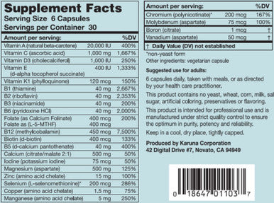 Karuna MAXXUM 3 is an iron free Multi-Vitamin to help support bone health.Recommended use: is 6 tablets daily with meals or as recommended by your healthcare professional.