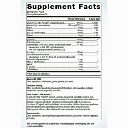 Each packet contains: 1 D3 5000 softgel (golden yellow), 1 Quercetin 500 capsule (Yellow), 1 Ultra Potent C 1000mg tablet (off-white with speckles), 2 Immune Active capsules (yellow orange).