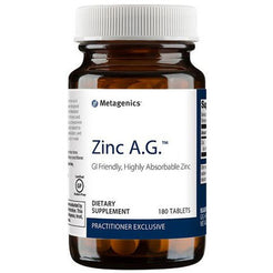 Metagenics Zinc A.G. is a dietary supplement for immune response support. This product offers zinc as a true amino acid chelate and is designed to be well tolerated with high absorbability. Zinc plays an important role as a component of many enzymes in the body that are involved in protein synthesis, energy metabolism, and bone mineralization. It plays a role in male reproductive health support and is important for immune and tissue health.Recommended use: Take one tablet one to two times daily or as directed by a healthcare professional.