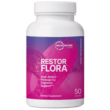 Microbiome Labs RestorFlora supports intestinal flora, intestinal health, bowel movement, digestion, immune health, maintains regularity, and the body's detoxification process.