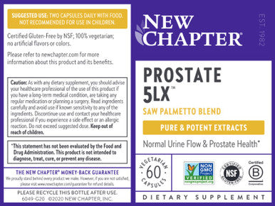 Prostate 5LX 60sg (Formerly Pros-5LO) Facts: Serving Size: 2 Softgels. Selenium; Probiotic Nutrients 50 mcg, Saw Palmetto supercritical extract 320mg (berry)(min. 272 mg total fatty acids), Green Tea extract 100mg (leaf)(min. 45 mg polyphenols), Organic Pumpkin Seed Oil 96mg (seed), Ginger 80mg (rhizome) 43.2 mg supercritical extract (min. 13 mg pungent compounds; min. 3.5 mg zingiberene) and 36.8 mg hydroethanolic extract (min. 1.1 mg pungent compounds), Stinging Nettle hydroethanolic extract 10:1 50mg (Urtica dioica)(root), Stinging Nettle aqueous extract 5:1 50mg (Urtica dioica)(root), Rosemary supercritical extract 10mg (leaf)(min. 2.3 mg total phenolic antioxidants [TPA]). Also includes: Capsule (Gelatin [Halal], vegetable glycerine, water and carob), extra-virgin olive oil, maltodextrin, yellow beeswax, and organic sunflower oil. Contains: Fermented soy and fermented wheat (as food source for Saccharomyces cerevisiae). Gluten free.