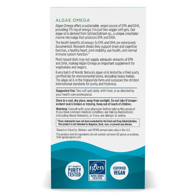 Nordic Naturals Algae Omega 60 Supports normal vision, heart health, positive mood, and immunity. Made from microalgae, it offers a plant-based source of beneficial marine omega-3s EPA and DHA without the use of fish. While most algae oils are short on EPA, Algae Omegas unique combination of EPA and DHA is a pure, safe, and effective source of both of these essential fatty acids.