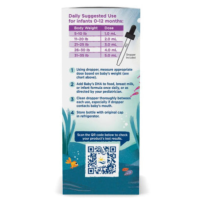 Recommended Use: 1 Using dropper, measure appropriate dose based on baby's weight (see chart). 2. Add to food, breast milk, or infant formula once daily, or as directed by a pediatrician. 3. Clean dropper thoroughly between each use, especially if dropper contacts baby's mouth. 4. Store bottle with original cap in refrigerator.