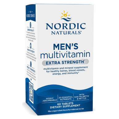 Nordic Naturals Men's Multivitamin Extra Strength tailored specifically to meet the unique nutritional needs of men. This exceptional multivitamin stands out as a beacon of health, providing a comprehensive blend of essential vitamins, minerals, and key nutrients in their most bioavailable forms. Supports Men's foundational health, prostate health, bone health, immunity, vascular health, energy production, and male physiology.