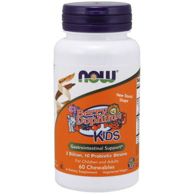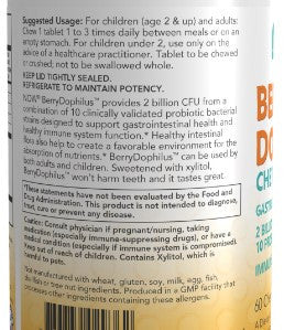 Now BerryDophilus kids chewables provides 2 billion CFU from a combination of 10 clinically validated probiotic bacterial strains to support gastrointestinal health and healthy immune system function. Healthy intestinal flora also helps to create a favorable environment for the absorption of nutrients. BerryDophilus can be used by both adults and children. Sweetened with xylitol, BerryDophilus won't harm teeth and it tastes great.Recommneded Use: For children (age 2 & up) and adults: Chew 1 tablet 1 to 3 times daily between meals or on an empty stomach. For children under 2, use only on the advice of a healthcare professional. Tablet to be chewed or crushed; not to be swallowed whole. KEEP LID TIGHTLY SEALED. REFRIGERATE TO MAINTAIN POTENCY. Xylitol is harmful to pets; seek veterinary care immediately if ingestion is suspected.