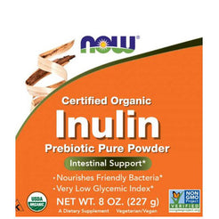 Now Inulin Prebiotic Pure Powder Organic Inulin, a fructooligosaccharide (FOS), is a soluble prebiotic fiber that is resistant to digestion and reaches the large intestine. Intestinal probiotic bacteria consume Inulin and in turn, produce the short-chain fatty acids that nourish the cells lining the colon. Inulin helps to maintain intestinal health and function. Inulin has a pleasant flavor that adds a mild sweetness to foods and drinks, but has a very low glycemic index and will not negatively impact serum glucose levels.Recommended Use: Take 1 level teaspoon 1 to 3 times daily, or as directed by a healthcare professional. Mix into your favorite beverage or food. Begin with 1 teaspoon a day and slowly increase dosage to limit GI discomfort. Store in a cool, dry place after opening.