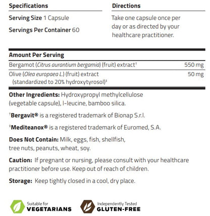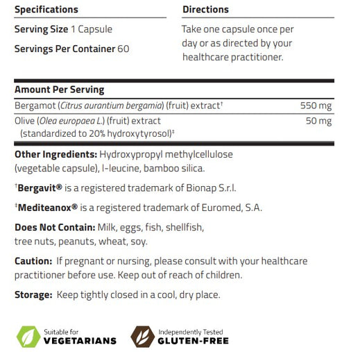 1 capsule once per day or as directed by a healthcare professional.- Bergamot (Citrus aurantium bergamia) (fruit) extract 550 mg