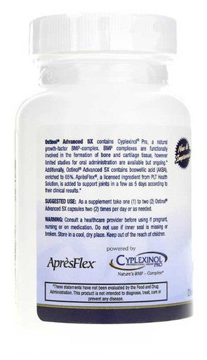 ZyCal Ostinol Advanced 5X Replacement for Ostinol Stat Pack. Contains Cyplexinol, a complex of proteins naturally found in bones and joints. The proteins are functionally involved in the formation of bone and cartilage tissue, while also helping the body fight inflammation. This formula also contains Acetyl-ketobeta-boswellic acid (AKBA) extracted from Boswellia serrata species. AKBA supports bone and joint health by enzyme inhibition associated with inflammatory pathways.