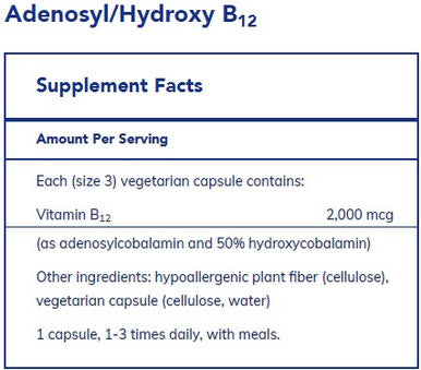 Pure Encapsulations Adenosyl/Hydroxy B12 delivers two active forms of vitamin B12 to support nerve function and mitochondrial energy production. This dual-form blend combines adenosylcobalamin and hydroxycobalamin to facilitate carbohydrate metabolism and promote healthy myelin synthesis. Formulated with hypoallergenic, vegan ingredients for optimal bioavailability and cellular support.