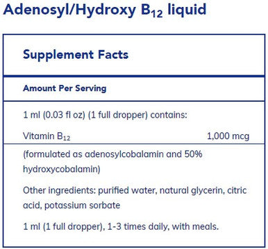 Pure Encapsulations Adenosyl/Hydroxy B12 Pure Encapsulations Adenosyl/Hydroxy B12 Liquid delivers two active forms of vitamin B12 to support nerve function and cellular energy production. This dual-form supplement combines adenosylcobalamin and hydroxycobalamin to promote healthy carbohydrate metabolism and myelin synthesis. Ideal for those seeking targeted mitochondrial and neurological support.