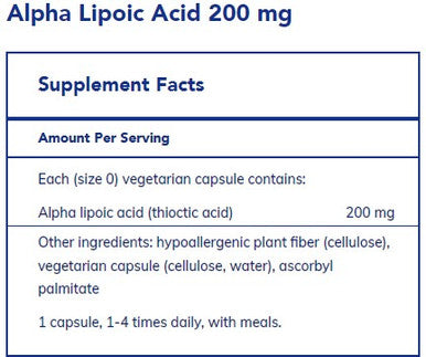Pure Encapsulations Alpha Lipoic Acid 200 is a water and fat-soluble antioxidant that supports cardiovascular health, glucose metabolism, and nerve function. Each capsule delivers 200 mg of alpha lipoic acid, a key nutrient for energy production and metabolic processes. The formula includes GlucoPhenol, a proprietary polyphenol compound that supports cellular signaling and enzyme function. Hypoallergenic and vegan, this supplement provides comprehensive antioxidant support throughout the body.
