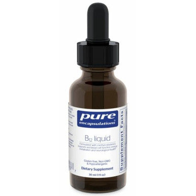 Pure Encapsulations B12 Liquid 1000mcg offers support for nerves, brain, and the immune system. B12 Liquid by Pure Encapsulations contains a form of vitamin B-12 known as methylcobalamin. B vitamins are an important part of our daily nutrition, vitamin B12 may be one of the most vital. Vitamin B12 is well known for its ability to boost energy levels. People with symptoms of fatigue often take B12 supplements. One of the reasons it's able to boost your energy is the fact that B12 is used in converting carbohydrates into glucose which is then used by your body as energy. Since vitamin B12 is linked to the process converting carbohydrates into glucose it also has an effect on your metabolism. Vitamin B-12 also helps promote red blood cell and heart health. Vitamin B12 also plays a pivotal role in the health of your nervous system: research indicates that this nutrient could promote protein synthesis which helps keep nerve cells healthy and active. One of the ways B12 does this is through promoting the production of a healthy myelin sheath that covers nerve fibers. A vitamin B12 deficiency can lead to neurological symptoms such as memory loss, mood changes, and even psychosis. For these reasons B12 is also known to promote mental well-being while possibly improving focus and concentration.