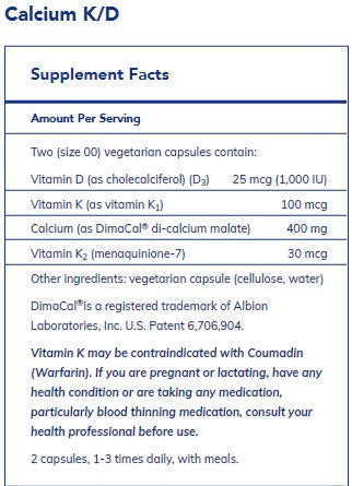 Pure Encapsulations Calcium K/D combines di-calcium malate with vitamins D and K to support bone strength and cardiovascular health. Calcium enhances absorption and retention, vitamin D promotes intestinal calcium uptake, and vitamin K activates bone-building proteins. This hypoallergenic, vegetarian formula delivers 180 capsules of targeted nutritional support for skeletal integrity and vascular wellness.