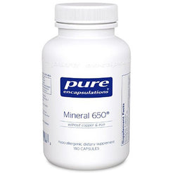 Pure Encapsulations Mineral 650 w-o Copper-Iron offers support for the heart, immune system, bone, cells, blood and metabolism. Mineral 650 without Copper and Iron by Pure Encapsulations provides highly absorbable forms of important minerals‚ including micro-minerals and trace minerals. Every capsule contains calcium‚ magnesium‚ zinc‚ selenium‚ potassium‚ iodine‚ boron‚ and more. This multimineral supplement is also manufactured with fat-soluble vitamin C to further promote absorption.Recommended use: 3 capsules, 1-2 times daily with meals, or as directed by a healthcare professional.
