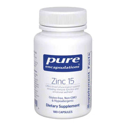 Pure Encapsulations Zinc 15 delivers 15 mg of highly absorbable zinc per capsule, formulated to support multiple physiological systems. This essential mineral plays a critical role in maintaining robust immune function, promoting healthy inflammatory response, and supporting reproductive health in both men and women. Zinc is also vital for digestive enzyme activity and nutrient absorption, helping optimize gastrointestinal health. Each bottle contains 180 vegetarian capsules, providing a convenient daily supplement. Formulated without common allergens and unnecessary additives, Pure Encapsulations Zinc 15 meets rigorous purity standards, making it an excellent choice for those seeking targeted nutritional support for immune resilience, fertility, and digestive wellness.