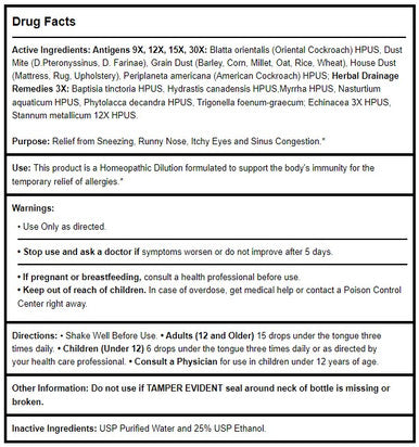Antigens 9X, 12X, 15X, 30X: Blatta germanica (German Cockroach), Dust Mite (D.Pteronyssinus, D.Farinae), Periplaneta americana (American Cockroach); Herbal Drainage Remedies 3X: Baptisia tinctoria 3X HPUS, Hydrastis canadensis 5X HPUS,Myrrha 3X HPUS, Nasturtium aquaticum 3X HPUS, Phytolacca decandra 3X HPUS, Trigonella foenum-graecum; Echinacea 3X HPUS, Stannum metallicum 12X HPUS.