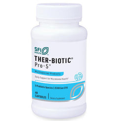Klaire-SFI Ther-Biotic Pro-5 Potent 25 billion CFUs, 5 strain formula enhances GI colonization. For individuals who need a high degree of support to balance intestinal microbiota. The 5 species in this formula work together to effectively increase colonization of the microorganisms in the small intestine and the colon. The transient and colonizing species in this formula have a high tolerance to stomach acid and bile.