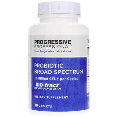 Progressive Labs Probiotic Broad Spectrum offers support for the intestines. The added BIO-tract delivery system protects the live organisms from gastric acid to ensure their delivery into the intestines. Fructo-oligosaccharides (FOS) for bacterial proliferation. No refrigeration required. Store in cool dry place.Recommended use: Take 1 caplet daily preferably in the morning or as directed by a healthcare professional.