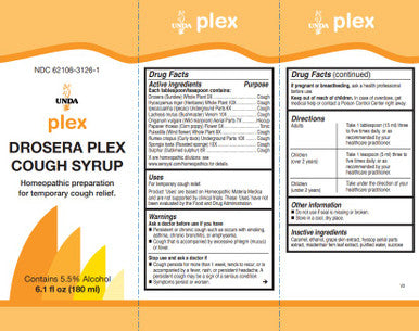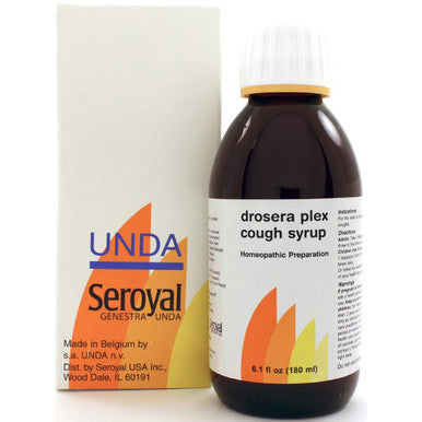 UNDA Drosera Cough Syrup Facts: Each dose (100 parts) contains: 1 part of: Hyoscyamus niger (Henbane) 8X , Lachesis mutus (Bushmaster) 8X , Rumex crispus (Yellow Dock) 8X , Spongia tosta (Roasted Sponge) 8X , Pulsatillia (Wind Flower) 6X , Sulfur (Sublimed Sulfur) 6X 0.4 Parts of: Hyssopus officinalis MT (Hyssop), Origanum vulgare MT (Oregano), Papaver rhoeas Liq. Ext. (Corn Poppy) 0.2 Parts of: Adiantum capillus-veneris MT (Maidenhair Fern), Drosera MT (Drosera), Ipecacuanha MT (Ipecac) Contains 4% alcohol. Other Ingredients: Ethanol, purified water, sucrose