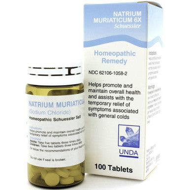 UNDA Natrium Muriaticum Facts: Natrum Muriaticum 6X, (Sodium Chloride). Also contains:Lactose monohydrate, xylitol, sodium carboxymethylcellulose, magnesium stearate.